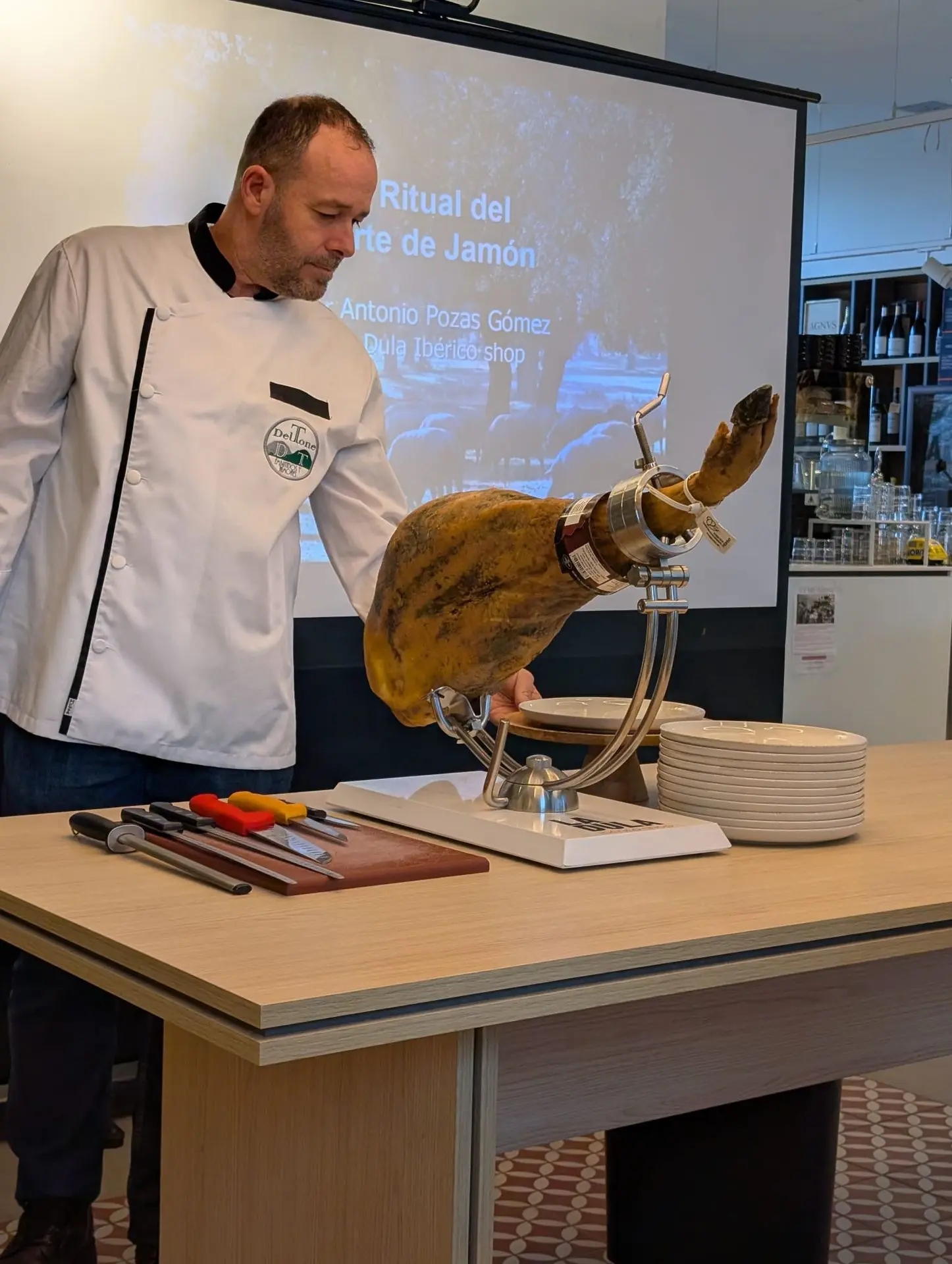 Vous découpez un véritable jamón ibérique sous la supervision directe du Maestro.